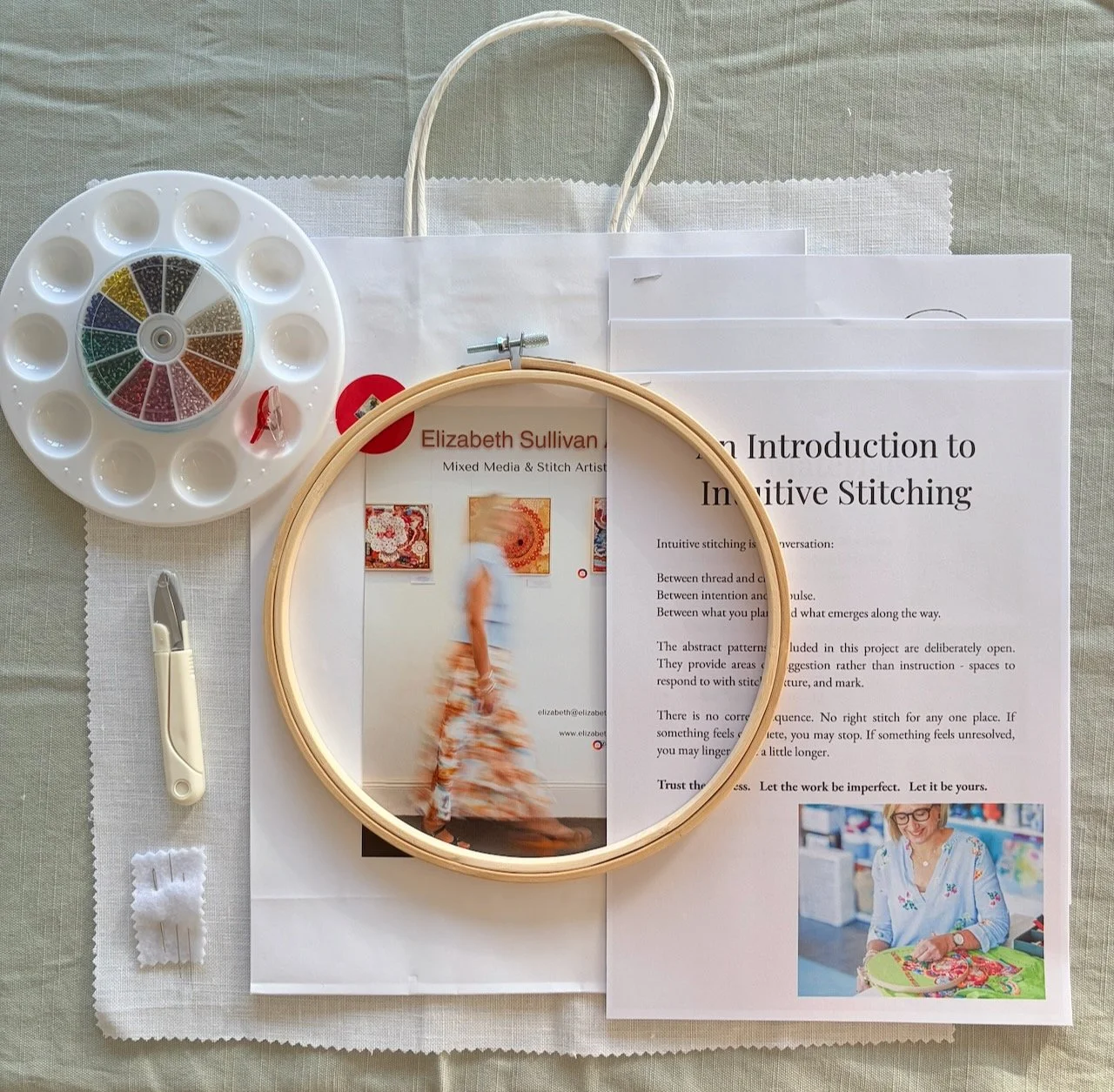 All materials are provided including linen, hoop, needles, scissors, threads, beads and other embellishments. While the piece is unlikely to be finished during the workshop, participants will take home enough materials to complete their work. Part of A Place To Begin PDF is included and forms the basis of the workshop